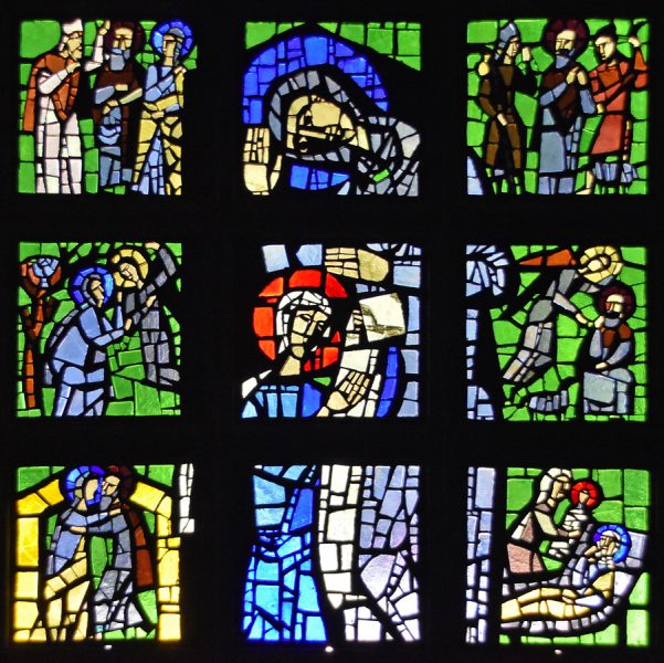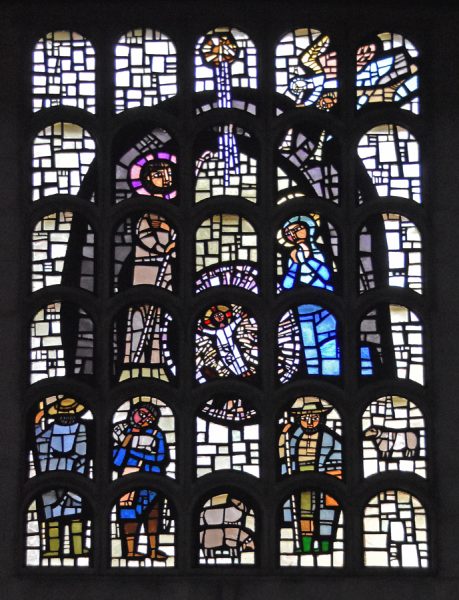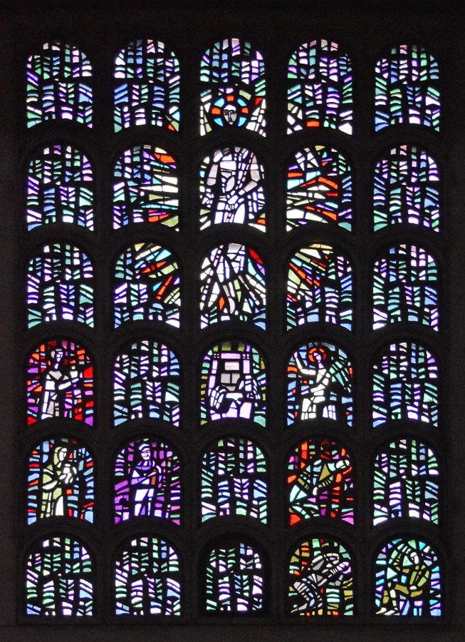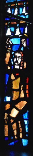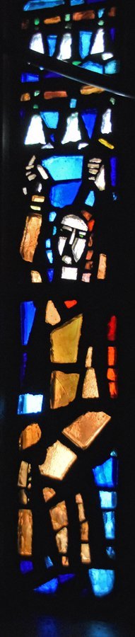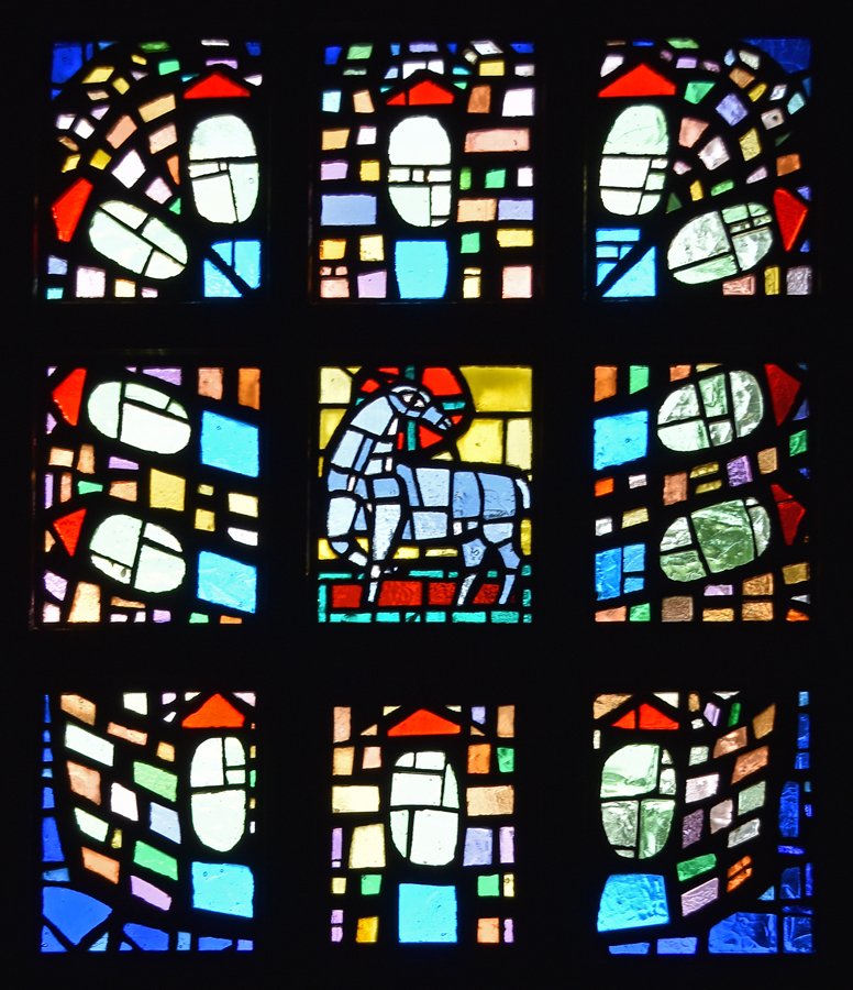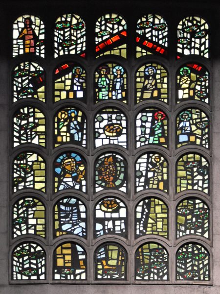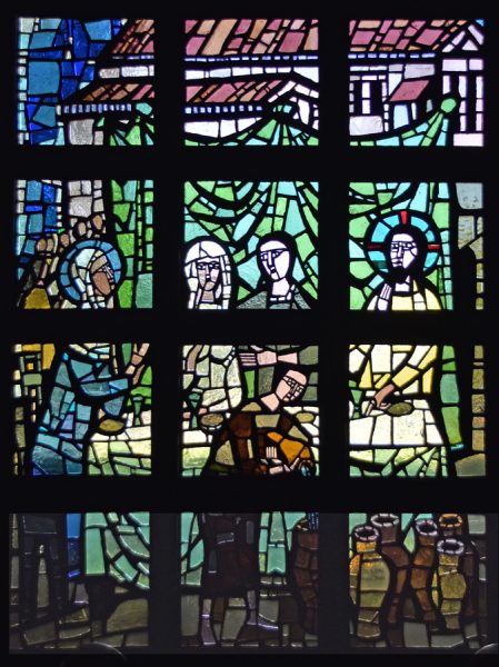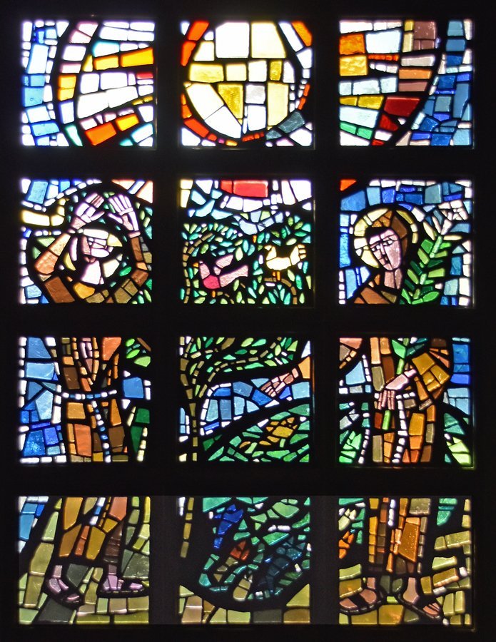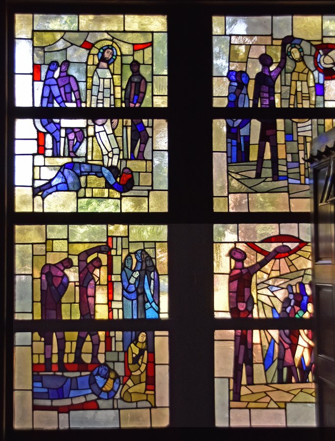 Deze vensters zijn beglaasd met glas-in-beton naar ontwerpen van kunstenaar Daan Wildschut (Grave, 1913-Bunde, 1995). Hij introduceerde deze “nieuwe” techniek in Nederland. (Dikke stukken gegoten glas (2,5 à 3cm) volgens tekening gekapt en in gewapend beton gevat. Het beton vormt een wezenlijk onderdeel van de compositie, grotere stilering, mozaïek-karakter, expressief. ) De ramen zijn alle vervaardigd en geplaatst door Atelier Flos uit Steyl (Tegelen).