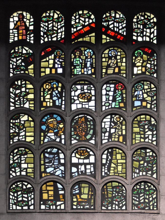 In de onderbouw 8 rechthoekige vensters met een betonnen vakindeling van 12 (4×3) vierkanten.