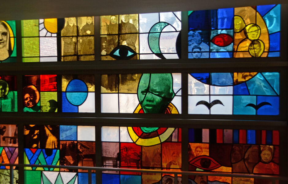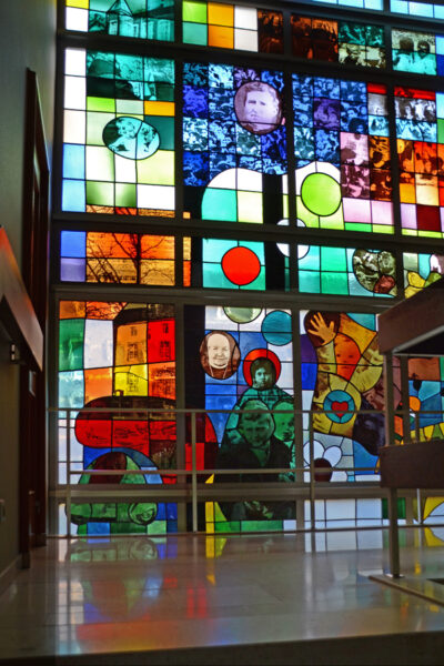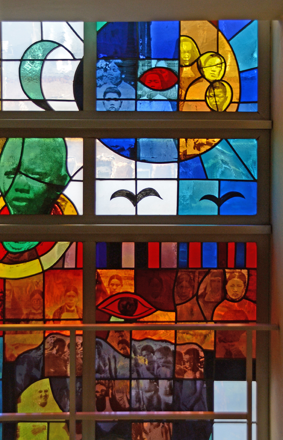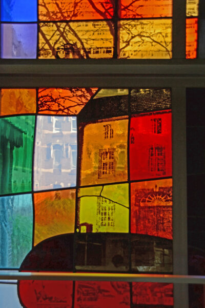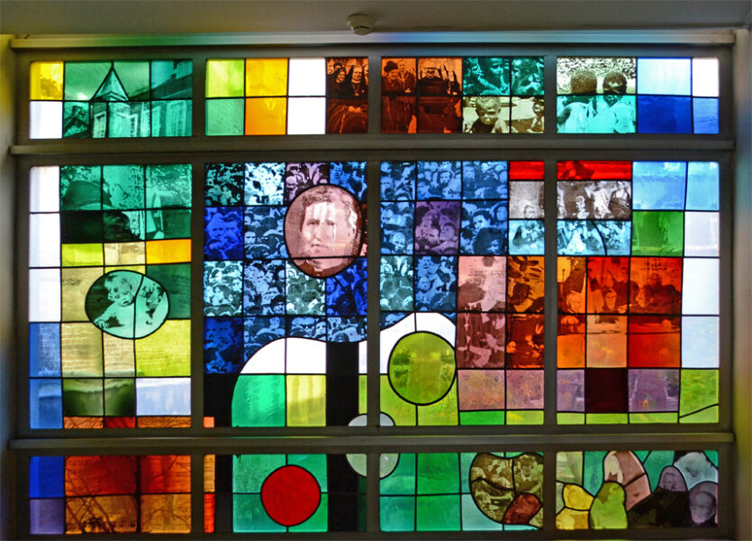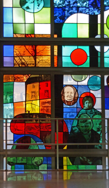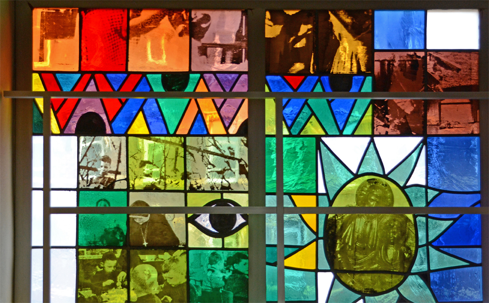 Truijen gebruikte hiervoor de zeefdruktechniek om fotografische beelden op glas aan te brengen en in te branden. Deze methode had hij eerder toegepast voor de glas-in-loodramen van de Martinuskerk in Maastricht (1966-’68), de zgn pop-art glas-in-loodramen.