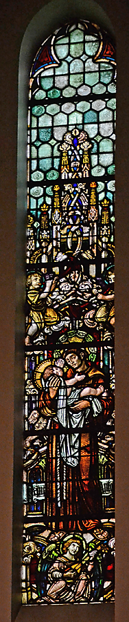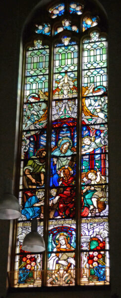 In de rechtergevel van het schip vier grote spitsboogramen met scènes uit het leven van de H. Familie. Van het Jozefraam (positie 9, op het oksaal) kon helaas geen foto gemaakt worden.