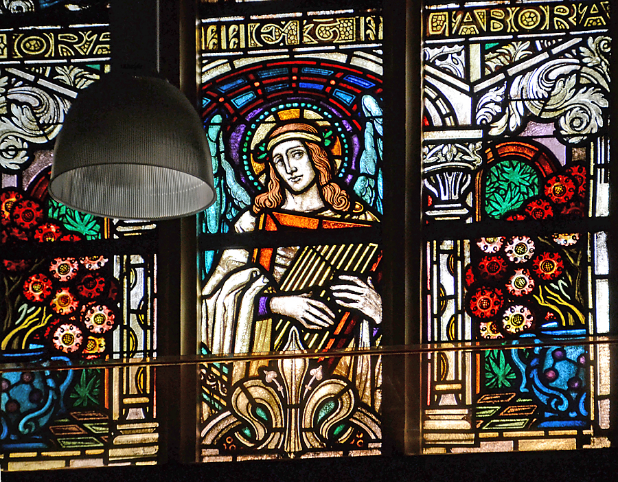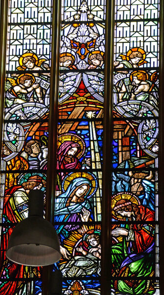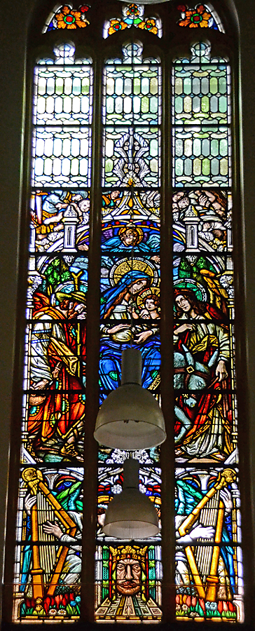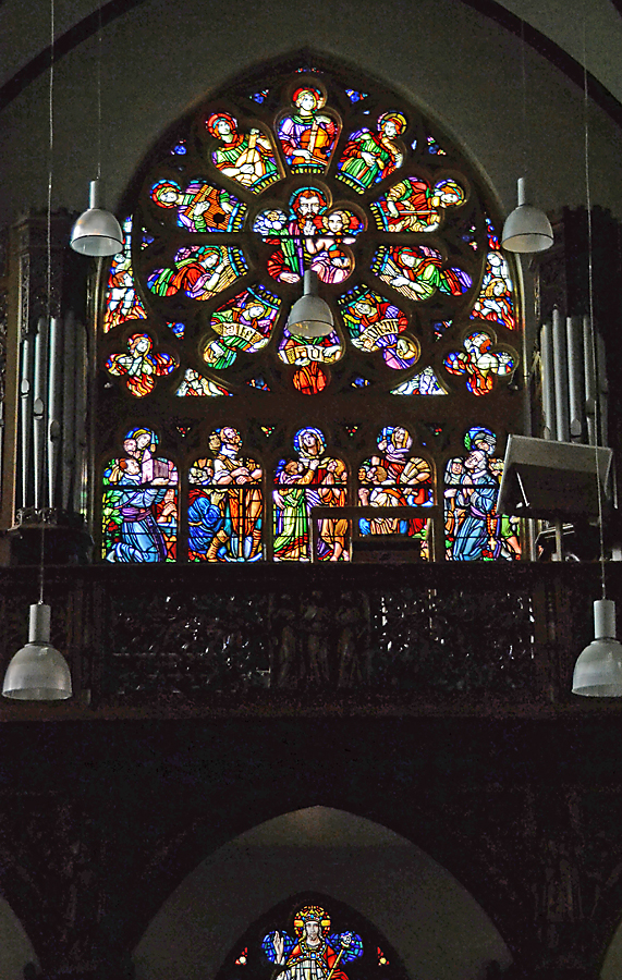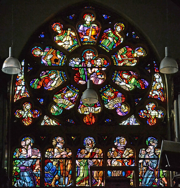 Boven het oksaal/orgeltribune in de voorgevel een roosvenster met centraal St. Jozef met kind Jezus omringd door musicerende engelen. Onder het roosvenster een rij gelovigen in aanbidding.