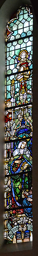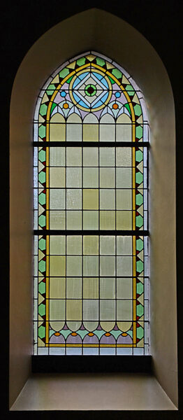 In de apsis vijf hoge smalle stompe spitsboogramen. Vier met afbeeldingen van heiligen en in het midden een ornamentraam. Helaas was het niet mogelijk om van drie ramen (positie 1, 2 en 3) bruikbare foto’s te maken.