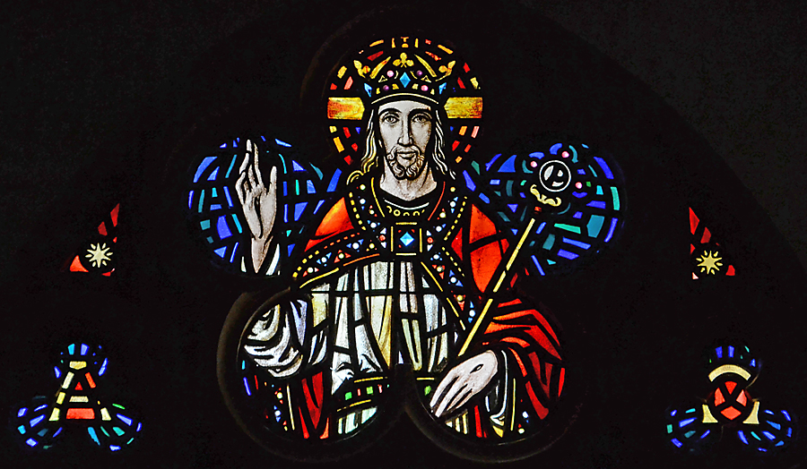Onder het oksaal in het maaswerk boven de toegangsdeur een afbeelding van Christus Koning met de Alpha en de Omega.