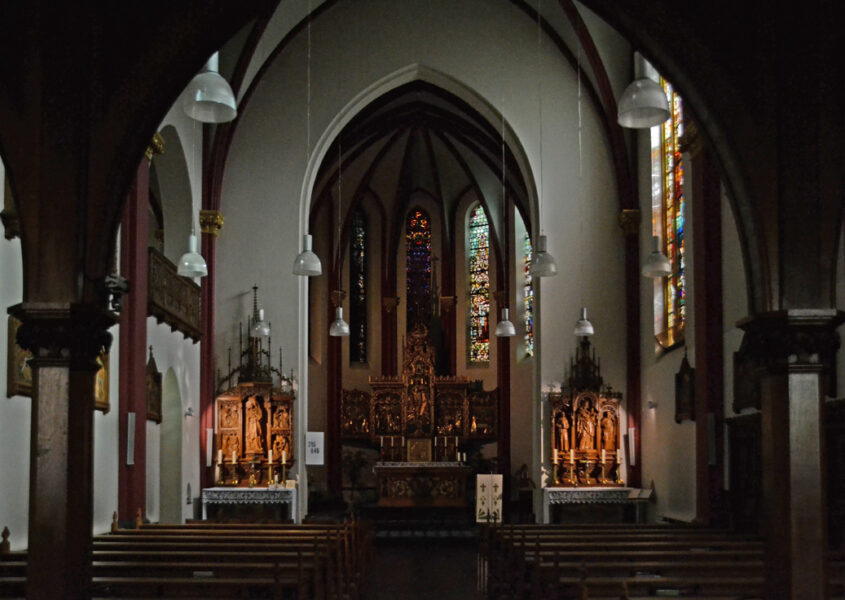 Aan de linkerkant wordt het schip door vier stompe spitsbogen gescheiden van de -in de tweede laag open- kloostergang. Vóór de openingen een galerij met houten balustrades. De galerij is bereikbaar vanuit het klooster en sluit aan op het oksaal. De balustrades van galerij en oksaal zijn versierd met fraai houtsnijwerk, evenals het altaar en de zijaltaren.