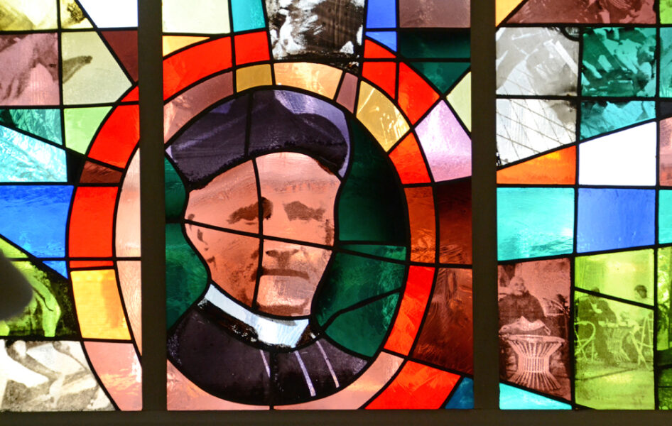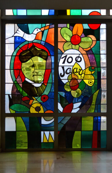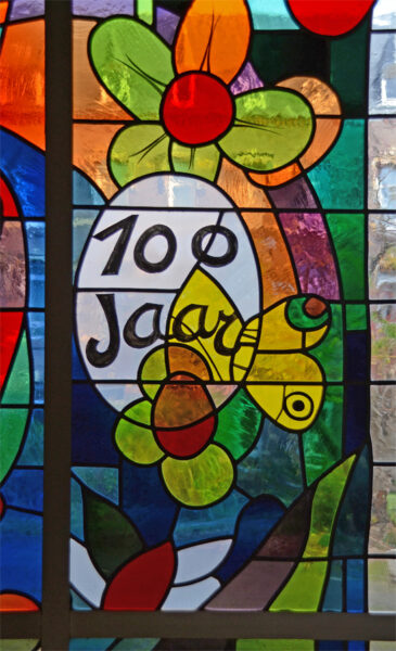 Zowel de figuratieve als de drie decoratieve glas-in-loodramen zijn geplaatst in de periode 1919-1921. Ze zijn ontworpen door Josef Raukamp (1881-1960) en vervaardigd in de Oberösterreichische Glasmalerei te Linz. Raukamp was eigenaar en bedrijfsleider van dit Oostenrijks glasatelier.