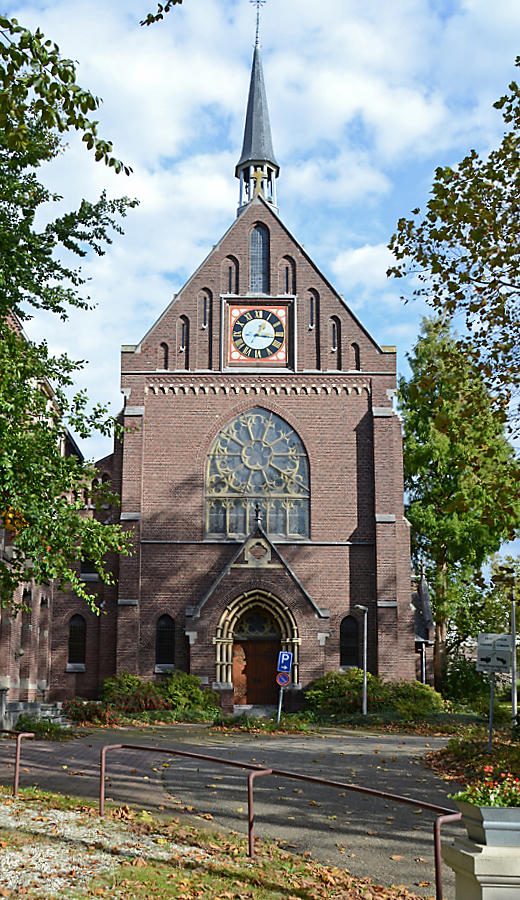 De voorgevel heeft een topgevel, aan weerszijden steunberen en links een zijbeuk, waarin de kloostergang. Centraal in de voorgevel een ingangsportaal met topgevel en een dubbele houten deur met bovenlicht. In het midden een groot venster waarin een rozet. Boven een boogfries de topgevel met centraal een uurwerk omgeven door negen spitsboognissen.