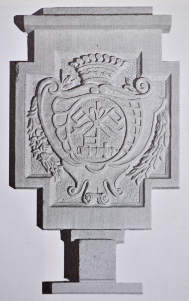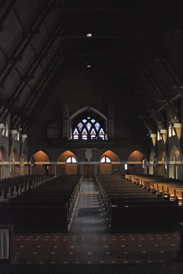 Achter in de kerk wordt het ingangsportaal van het schip gescheiden door vier bogen. In het midden tussen de tweede en derde boog is in natuursteen het wapen van de Parijse familie De Wendel aangebracht. Deze familie had in 1908 de Oranje Nassaumijnen gekocht van de Duitse gebroeders Honigmann, en heeft de bouwgrond voor de kerk met bijbehorend klooster gratis beschikbaar gesteld. De familie De Wendel schonk de parochie ook nog een kostbare monstrans.
