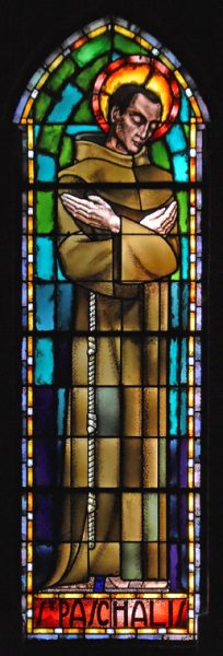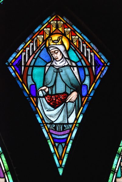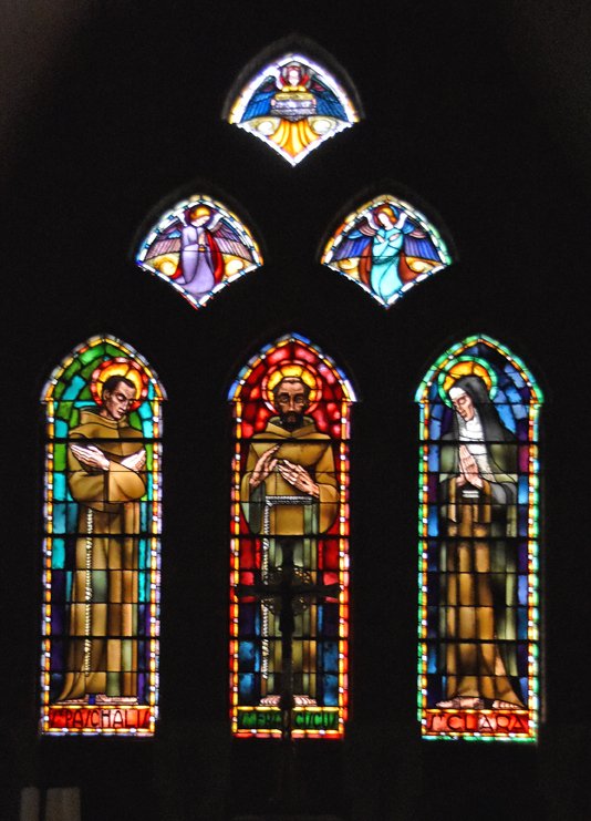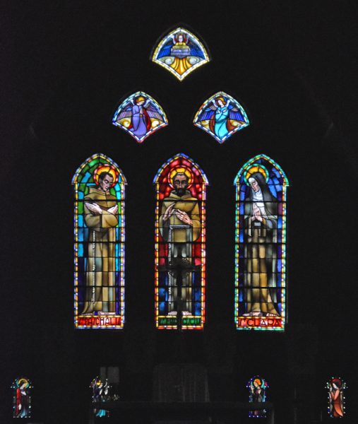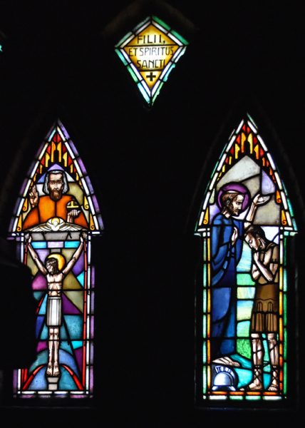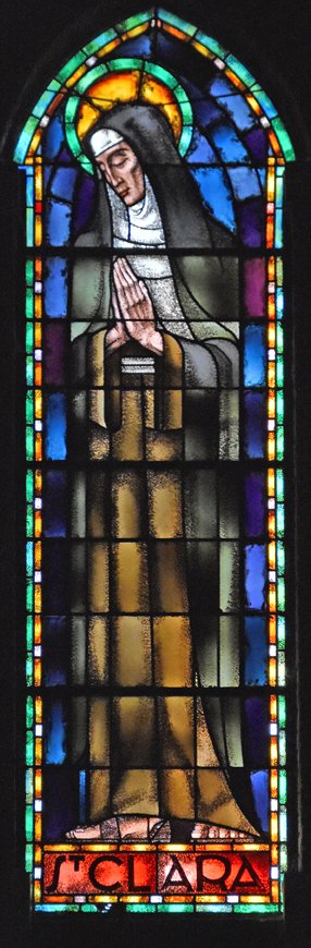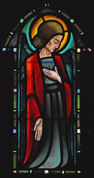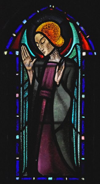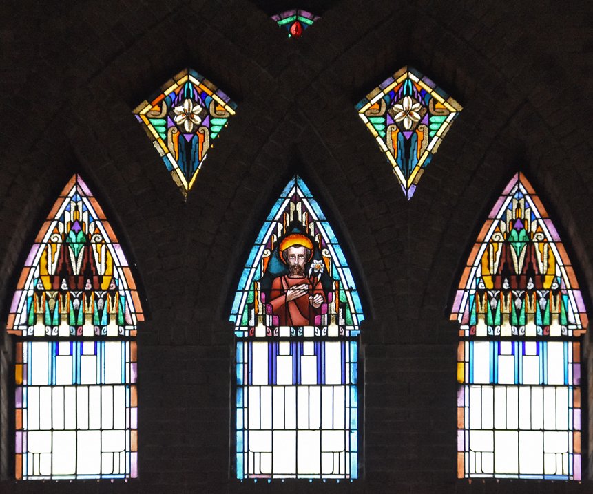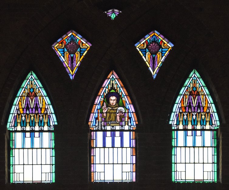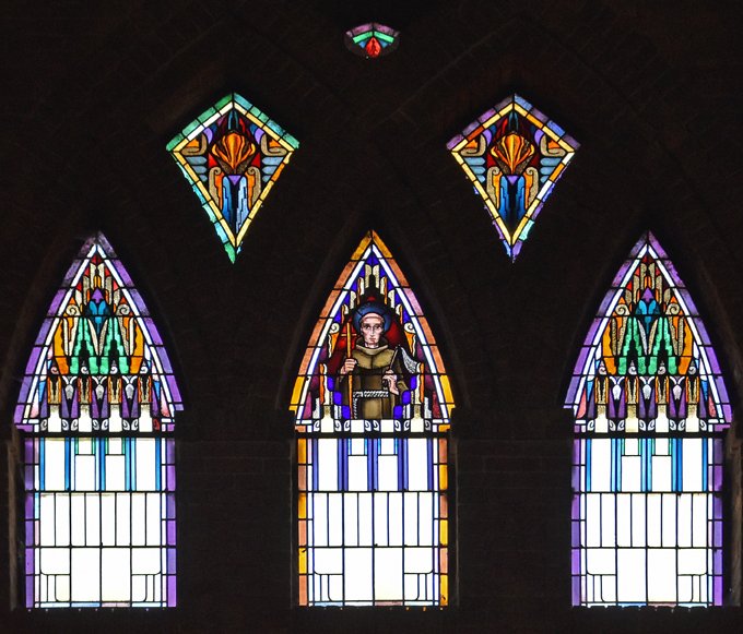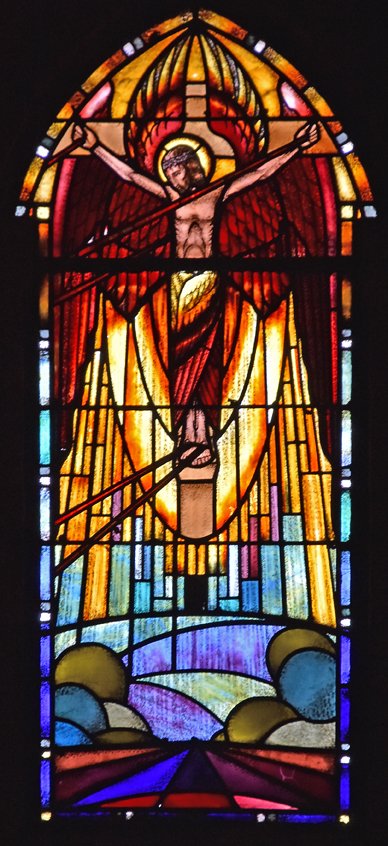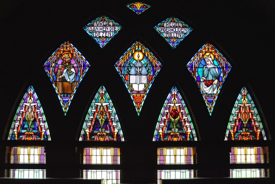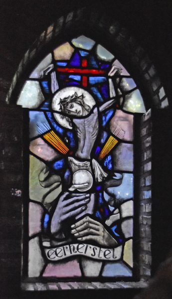 Van de kleinere vensters hebben slechts enkele figuratief glas-in-lood. Deze zijn ook van Alex Asperslagh, uit 1926.