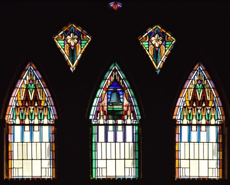 De kerk heeft opvallende, brede spitsboogvensters met traceringen van baksteen. De meeste hiervan (de lichtbeukvensters, het grote venster in de apsis, de vensters van de doopkapel en van de orgeltribune in de voorgevel) zijn beglaasd met kleurrijk glas-in-lood in art-decoachtige stijl van glazenier Alex Asperslagh (1901-1984). De ramen zijn geplaatst in 1926.