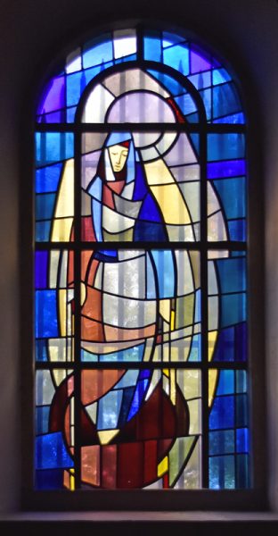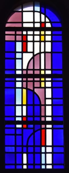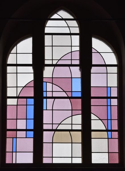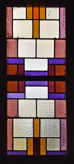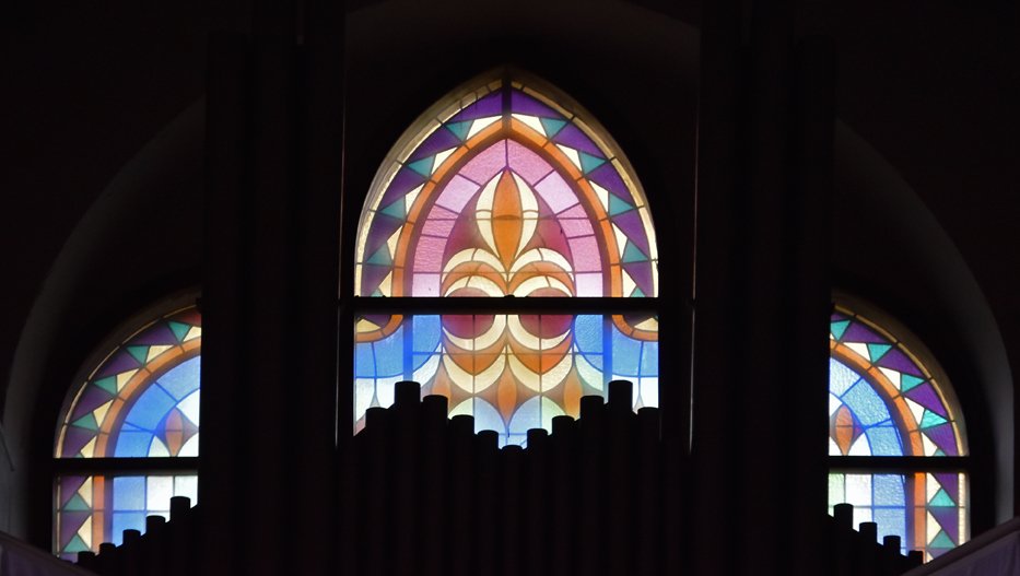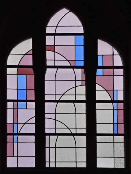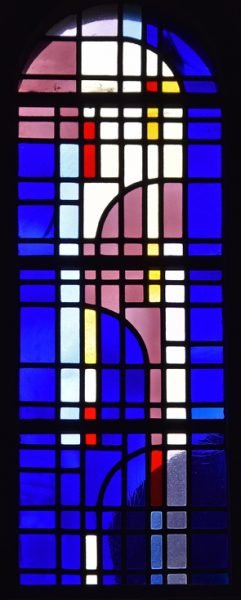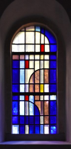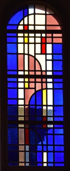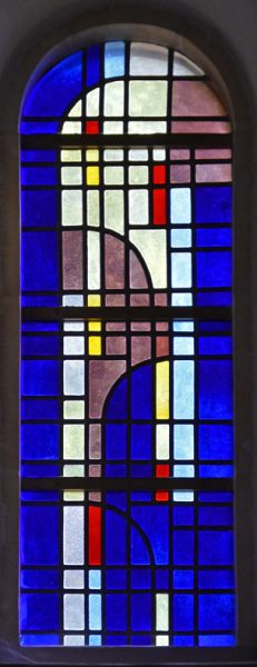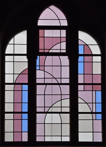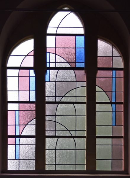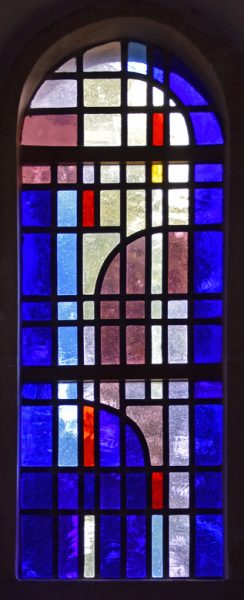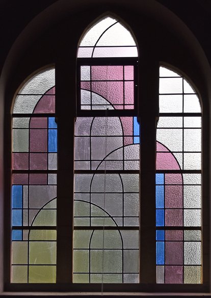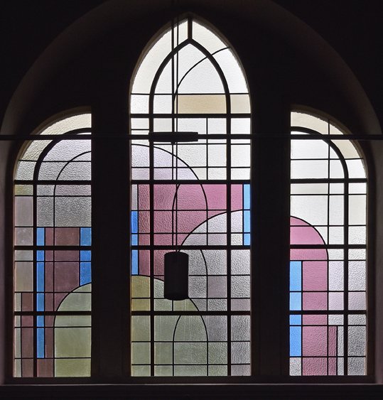 Het driedelige spitsboogvenster in de voorgevel achter de orgeltribune heeft een decoratief glas-in-loodraam uit 1928 van een onbekende kunstenaar.