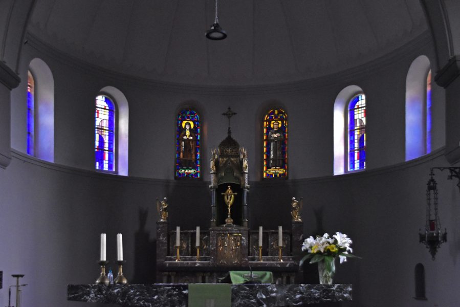 De oorspronkelijke glas-in-loodramen in een typische jaren twintig stijl zijn, waarschijnlijk tijdens de oorlogsjaren, grotendeels verloren gegaan.