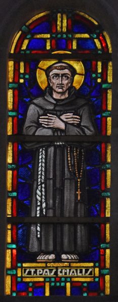 In de apsis zes rondboogvensters met twee glas-in-loodramen uit 1928 met afbeeldingen van Franciscaanse heiligen van een onbekende kunstenaar en vier ornamentramen van Hub Pasmans uit 1981-’82. De ornamentramen links en rechts zijn elkaars spiegelbeeld. In de Lourdesgrot een gestileerd Maria-raam van Pasmans (1982).