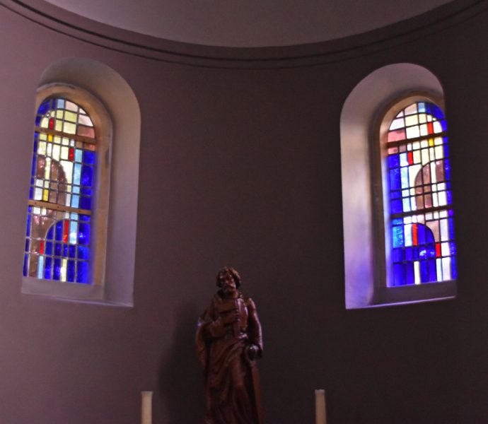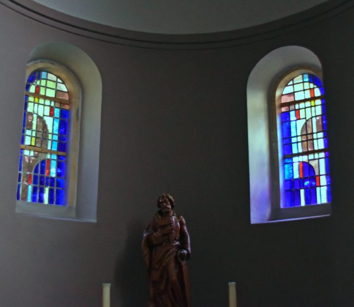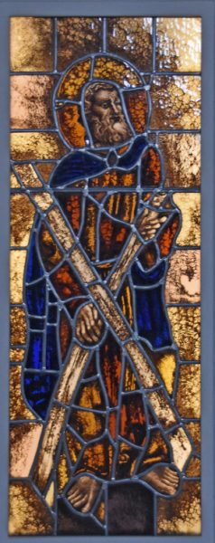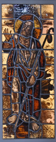 Positie 25, twee glas-in-loodramen met de apostelen Andreas en Jacobus de Meerdere), in vrijstaande lichtbak, Charles Eyck, 1935, afkomstig uit de afgebroken O.L. Vrouw van Lourdeskerk in de wijk de Gracht.
