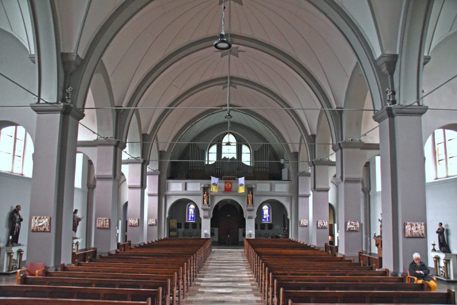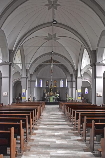 Het schip en transept zijn afgedekt met spitsbooggewelven. De gewelven zijn als gevolg van mijnschade bekleed met plaatmateriaal. Het sobere karakter van het kerkgebouw wordt onderstreept door de overheersende witte tint van het interieur.
