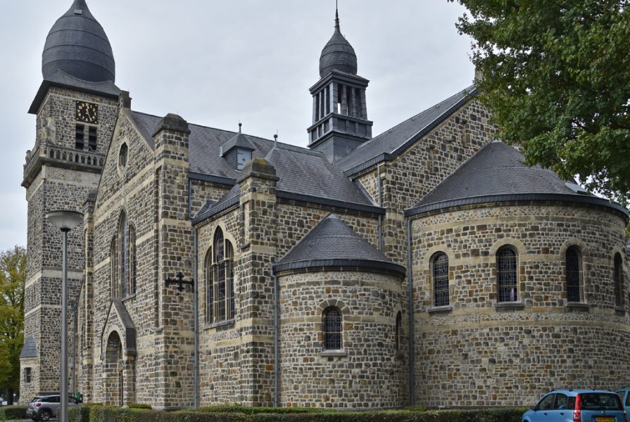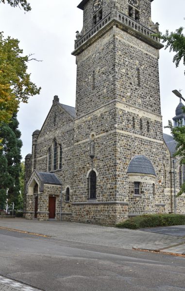 Het is een driebeukige pseudobasilicale kruiskerk. Georiënteerd. Opgetrokken in Nievelsteiner zandsteen, mergel en hardsteen. De gevels horizontaal geleed door banden van mergel. Het schip, transept en koor met zadeldak, gedekt met leien. Aan de rechterkant van de voorgevel een klokkentoren met een opvallende ui-vormige spits (peerspits). Op de viering een angelustoren eveneens met ui-vormige spits. Rondom de klokkentoren onder de uurwerken een uitgebouwde galerij met op de hoekpunten beelden van de vier evangelisten voorgesteld door hun symbolen,  onderaan de toren in de voorgevel een nis met een beeld van Sint Jozef (1928).