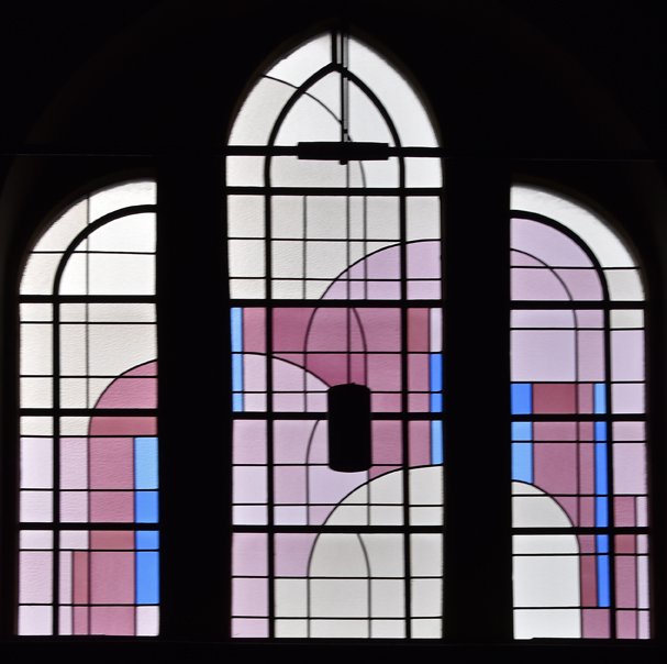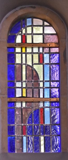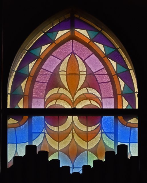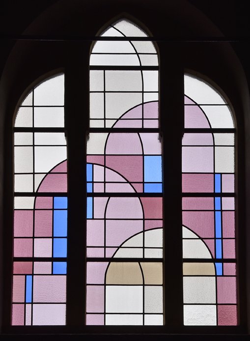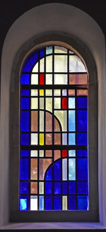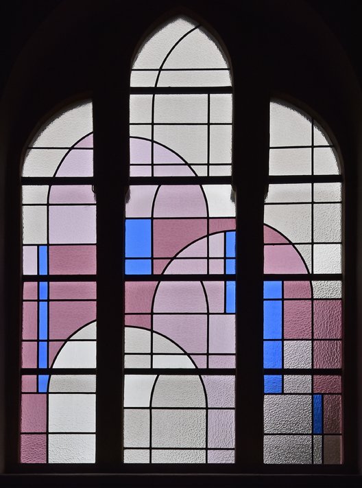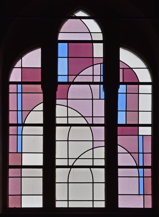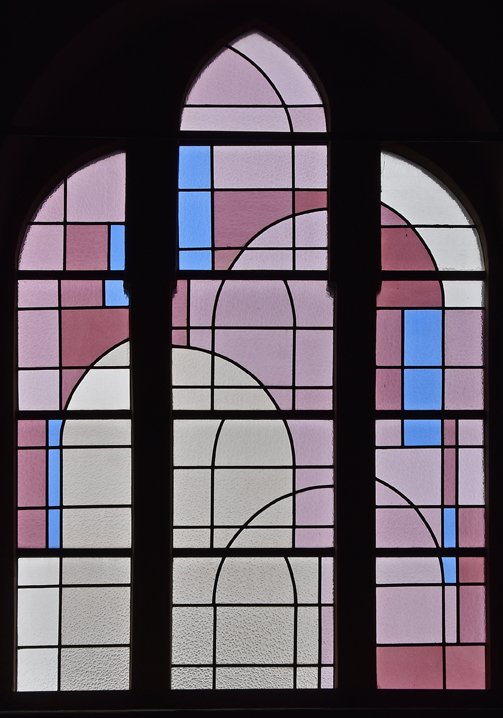 Het driedelige spitsboogvenster in de voorgevel achter de orgeltribune heeft een decoratief glas-in-loodraam uit 1928 van een onbekende kunstenaar.
