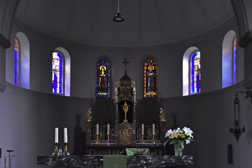In de apsis zes rondboogvensters met twee glas-in-loodramen uit 1928 met afbeeldingen van Franciscaanse heiligen van een onbekende kunstenaar en vier ornamentramen van Hub Pasmans uit 1981-’82. De ornamentramen links en rechts zijn elkaars spiegelbeeld. In de Lourdesgrot een gestileerd Maria-raam van Pasmans (1982).