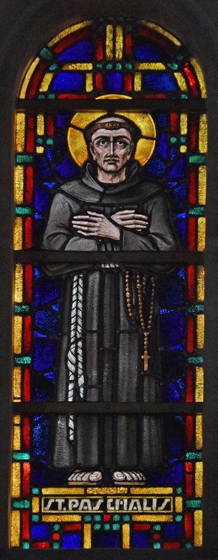 Positie 25, twee glas-in-loodramen met de apostelen Andreas en Jacobus de Meerdere), in vrijstaande lichtbak, Charles Eyck, 1935, afkomstig uit de afgebroken O.L. Vrouw van Lourdeskerk in de wijk de Gracht.