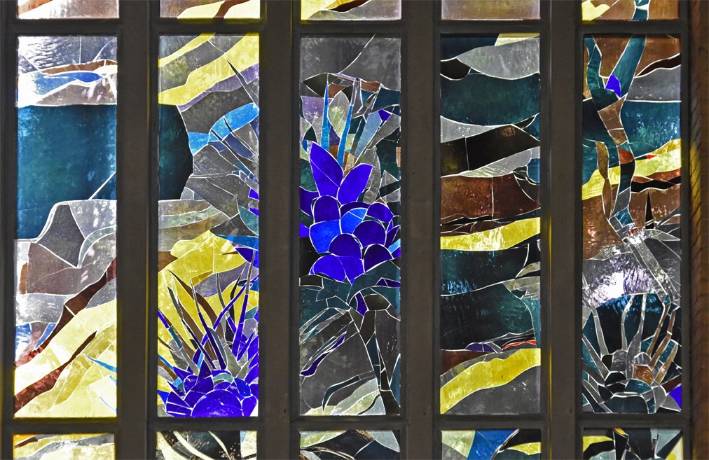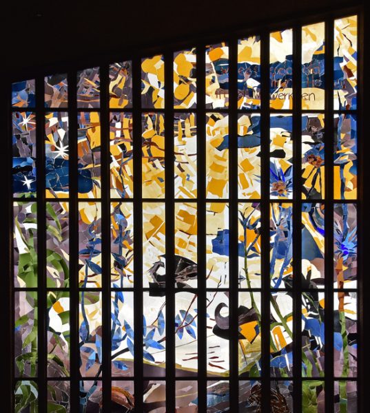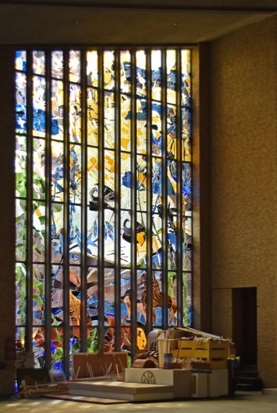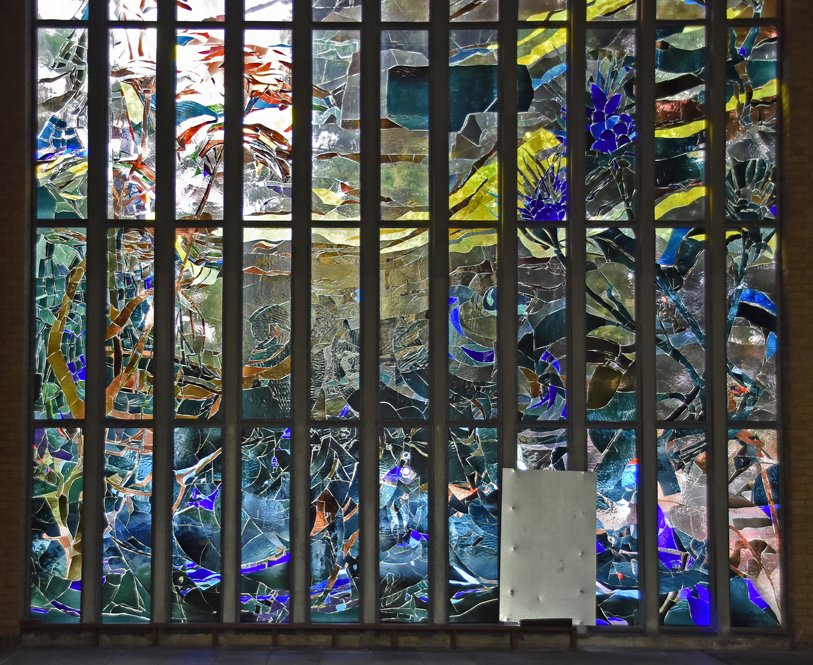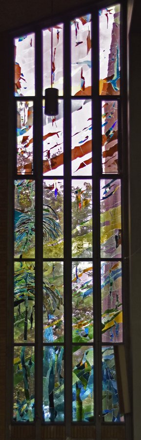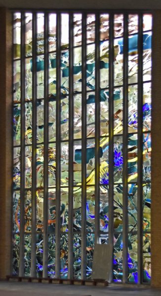 Zowel links als rechts van het voorportaal twee grote raampartijen gemaakt van claustra’s, de openingen gevuld met blank glas. In beide zijgevels van het schip een grote vensterpartij geleed door smalle betonpijlers. De vensters lopen van maaiveld tot aan de daklijst. In de zijgevels van het priesterkoor eveneens een grote, hoge vensterpartij analoog aan die van het schip maar minder breed. In 1991 werd groot onderhoud uitgevoerd.