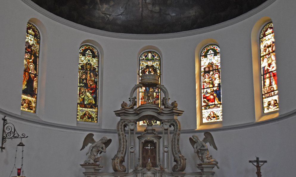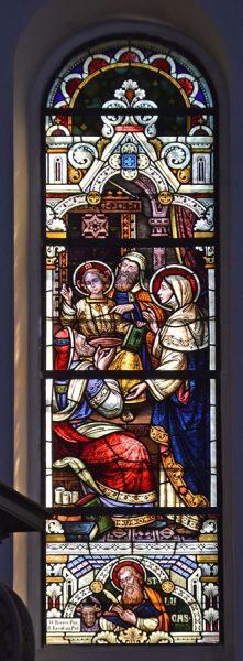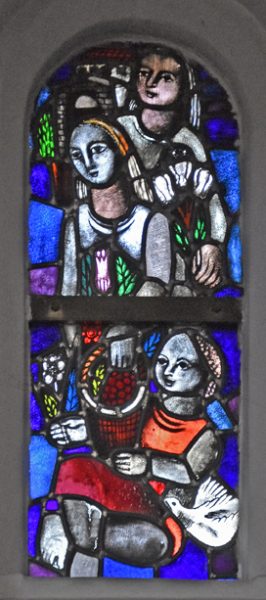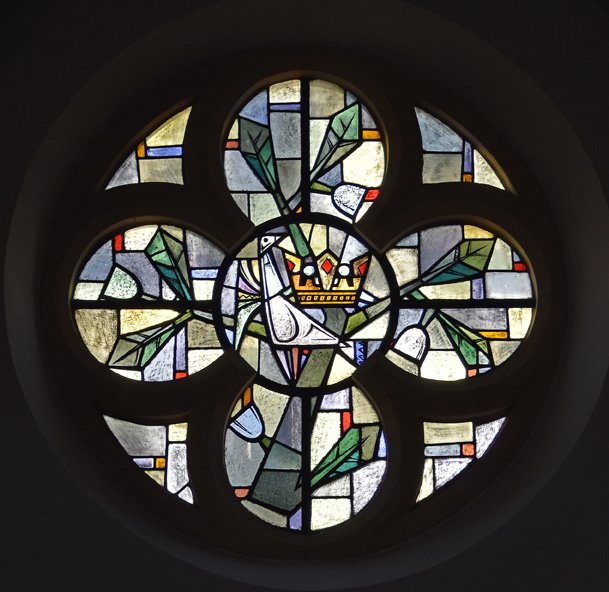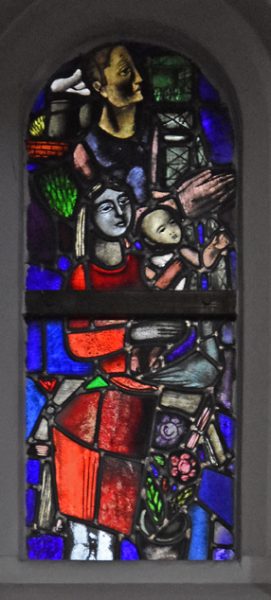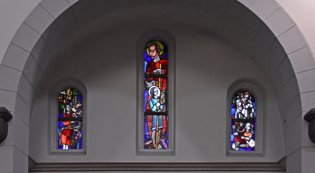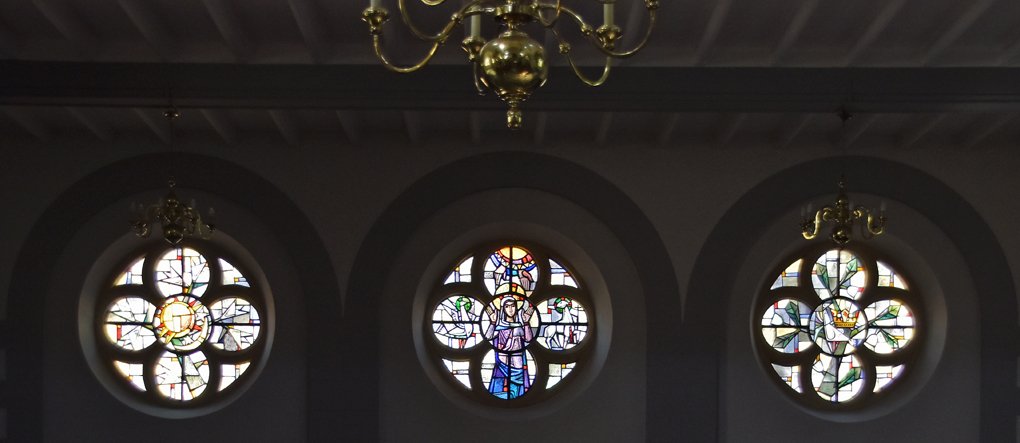 Het drietal glas-in-loodramen uit 1949 in het noordertransept is van Jérôme Goffin (Maastricht, 1921-1963).