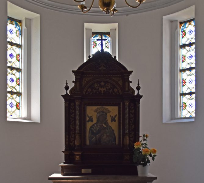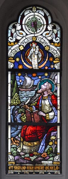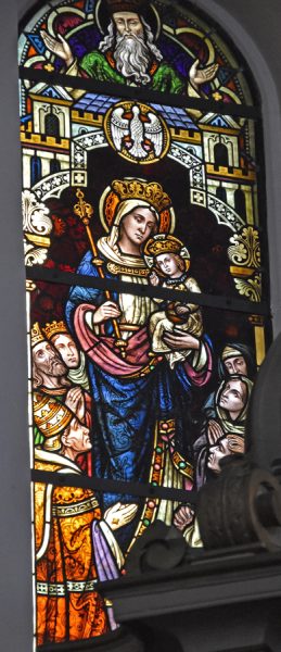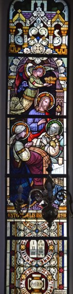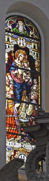 De Mariakapel onder in de toren heeft rechthoekige ornamentramen uit 1917 waarvan de maker onbekend is.