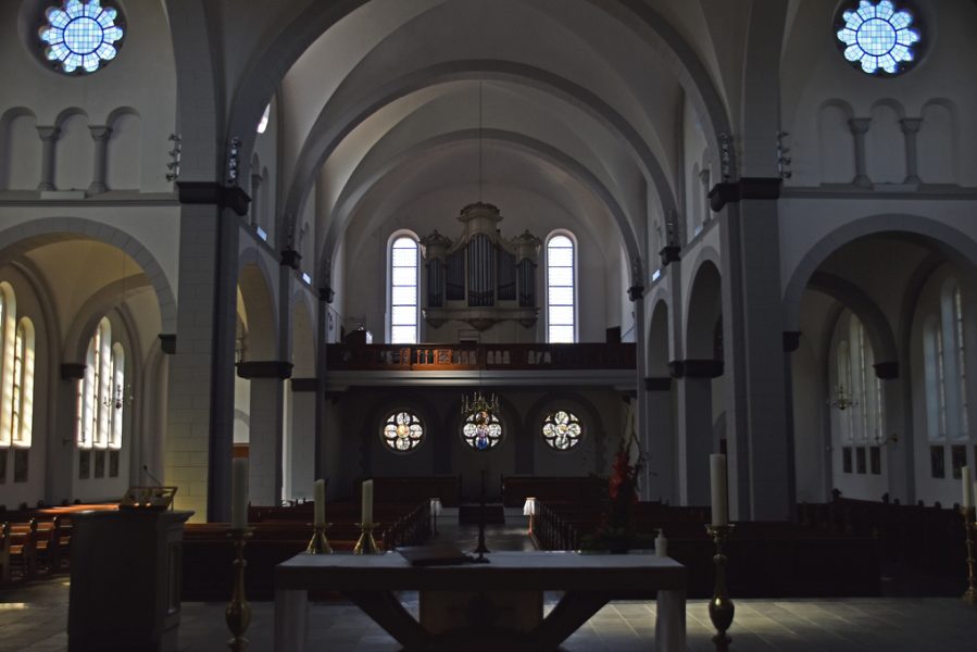 De neo-romaanse kerk heeft rondboogvensters en ronde vensters.