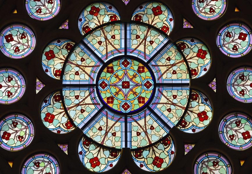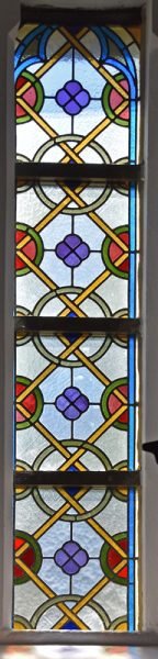 De kleinere roosvensters in de lichtbeuk zijn beglaasd met lichtgetinte glas-in-loodruitjes. Maker onbekend.