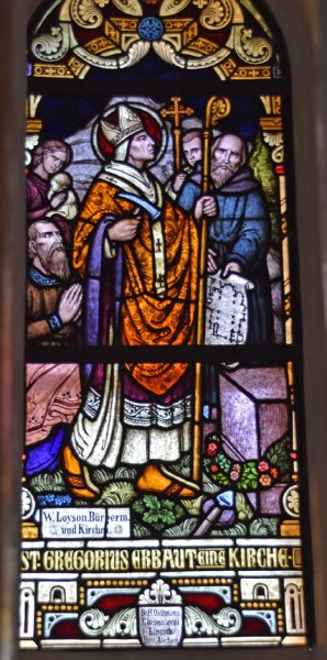 De rondboogvensters in de apsiswand en in de Gregoriuskapel achter het altaar zijn voorzien van gebrandschilderde glas-in-loodramen uit 1917 gemaakt door glasatelier Dr. Heinrich Oidtmann in het Duitse Linnich. De glas-in-loodramen (1917) in de drielichtvensters in de zijbeuk van de Gregoriuskapel en in de zijbeuk links van het Maria-altaar zijn eveneens van Oidtmann. De Glasmalereiwerkstatt Dr Heinrich Oidtmann stond in de jaren 1912-1929 onder leiding van Heinrich Oidtmann III (1888-1929).