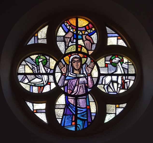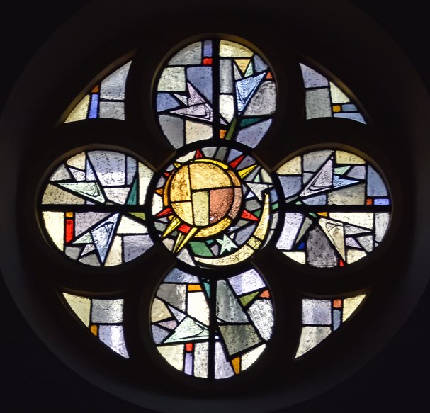 Positie 1, 2, 3, drie vierpasramen onder de orgeltribune, in de voorgevel naast de hoofdingang, symbolen van Maria, Jacques  Verheyen, 1961,