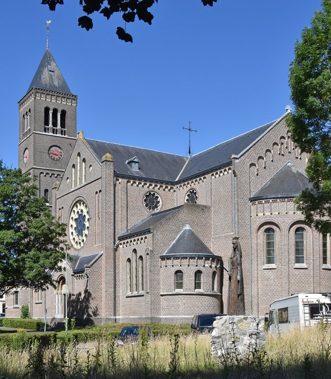 De neo-romaanse kerk heeft rondboogvensters en ronde vensters.