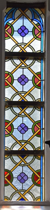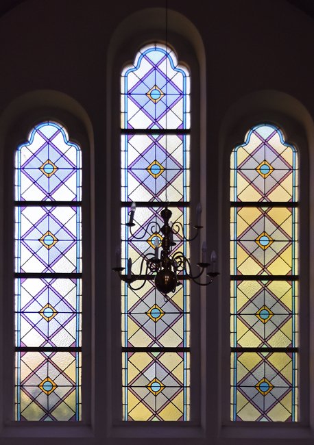 De kleinere roosvensters in de lichtbeuk zijn beglaasd met lichtgetinte glas-in-loodruitjes. Maker onbekend.