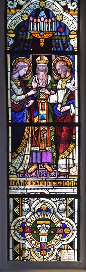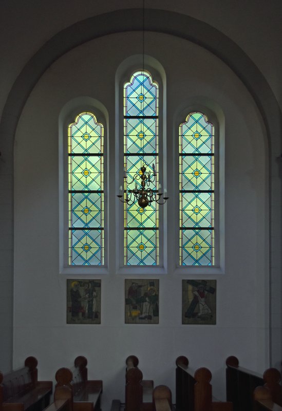 Het drietal glas-in-loodramen uit 1949 in het noordertransept is van Jérôme Goffin (Maastricht, 1921-1963).