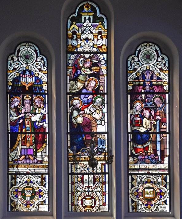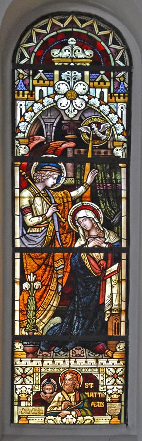 Positie 9, Maria-altaar, dr. Heinrich Oidtmann, 1917, groep van drie ramen betreffende Maria-mysterie