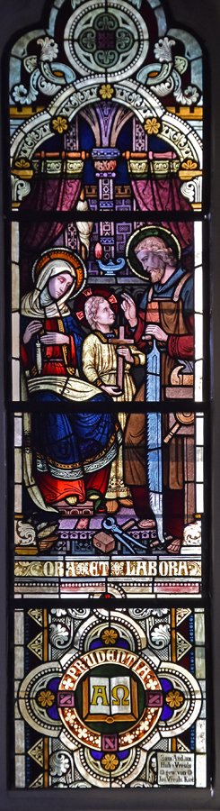 De Heilige Familie, tekst: “Ora et Labora”, Prudentia (verstandigheid) en Alpha en Omega (het begin en einde)