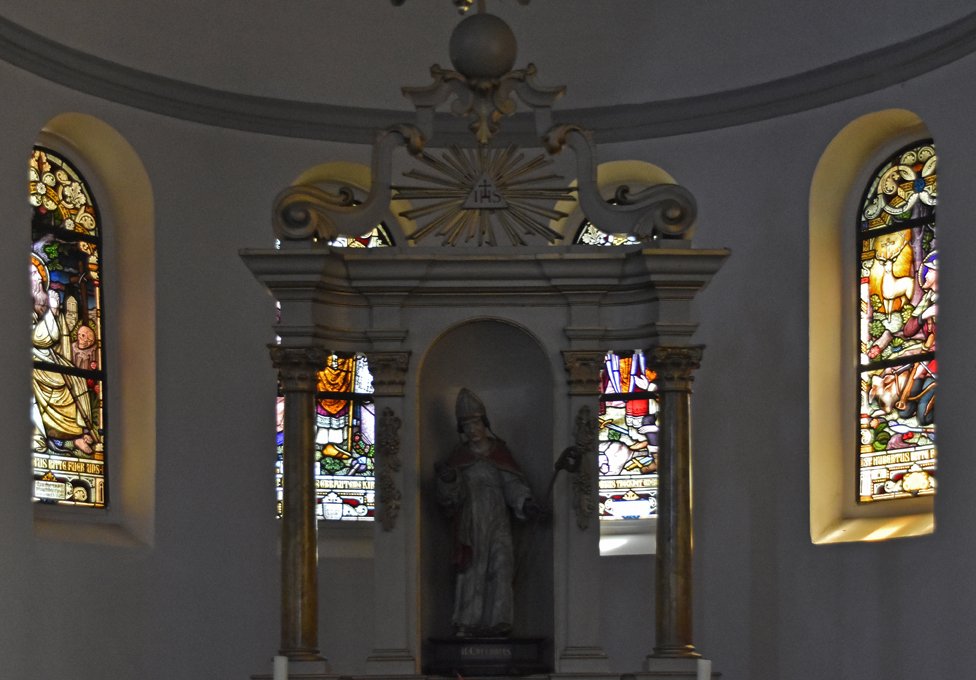 Tegen de achterwand en het plafond van de apsis wandschilderingen van Eugène Laudy (1921-1995) uit 1942. De kerk bezit een laatbarok-altaar gebouwd omstreeks 1765 naar een ontwerp van architect J. Couven uit Aken, en afkomstig uit de voormalige parochiekerk “Sjpaans Kentje”.