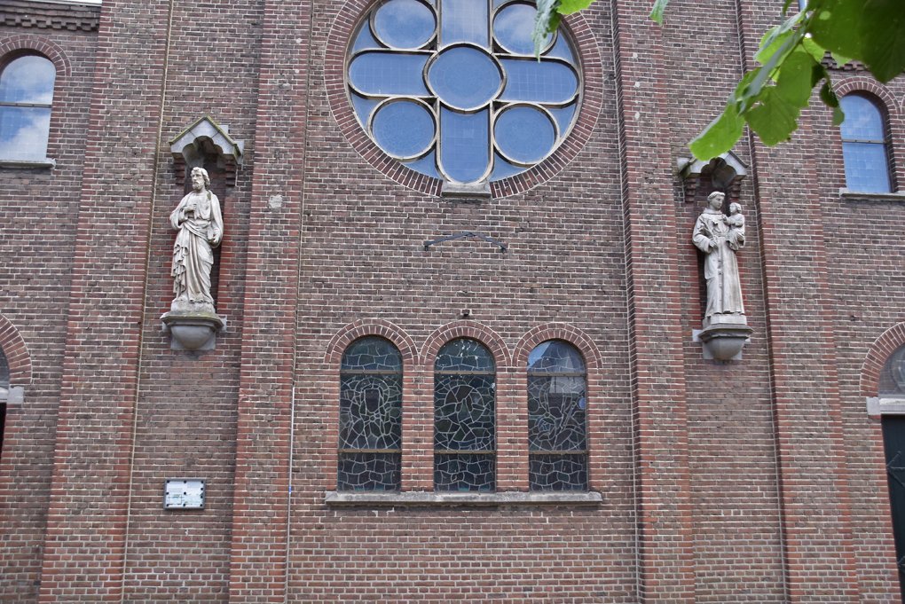 Tegen de voorgevel twee beelden van L. Schoepen (Aachen) uit 1900: rechts St. Antonius van Padua en links St. Petrus