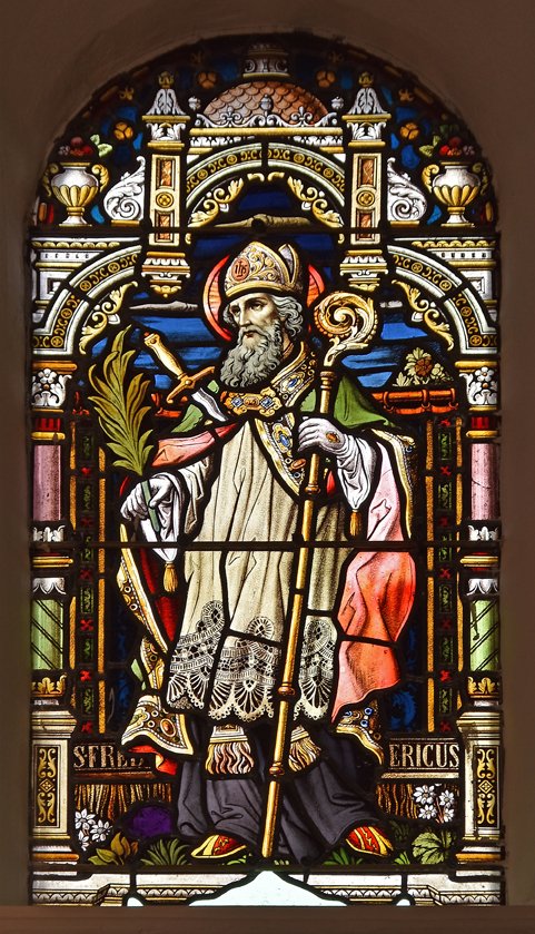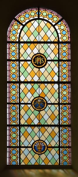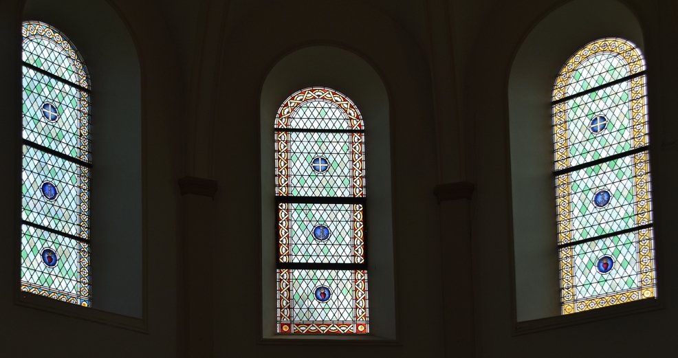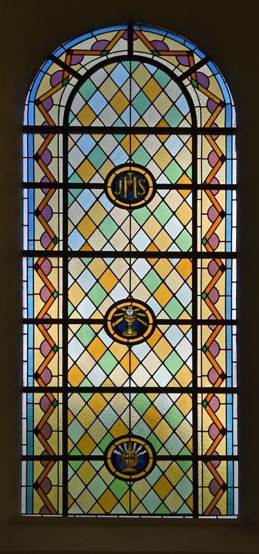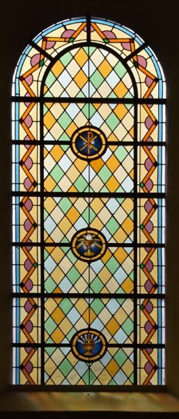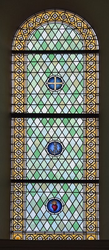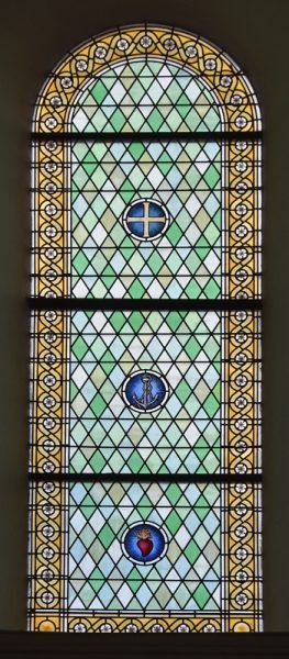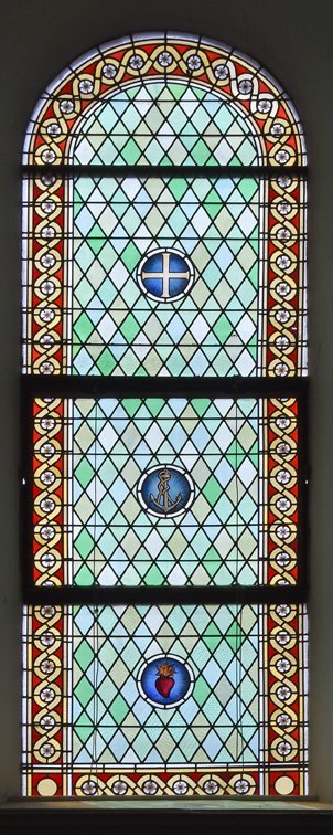 Ornamentramen met christelijke symbolen in kleine vignetten in de zijgevels van het schip en de transeptarmen uit ca. 1950. De maker is onbekend.